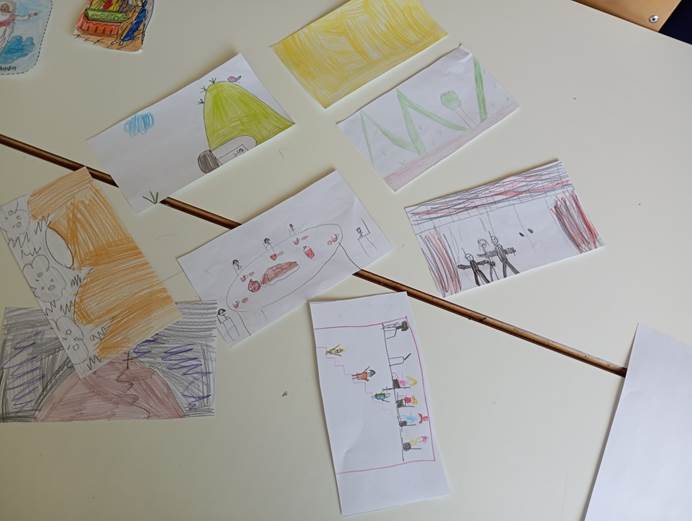 Έπειτα δημιούργησαν τα σκηνικά της παράστασης, τα οποία μπήκαν στη σειρά για να δημιουργηθεί μια κυλιόμενη ταινία η οποία θα περνάει μέσα από δυο σχισμές στο κουτί.
